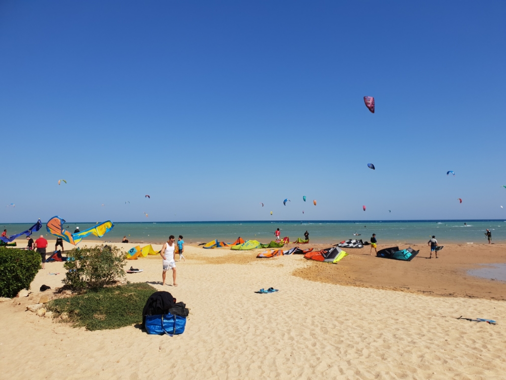 All the spots in El Gouna are basically pretty similar. Very good for beginners to make their first meters – but of course also for advanced riders enjoying the lagoon. You always have a shallow lagoon where everybody is riding and practicing and farer outside (I think it’s more than 200m at most beaches) it’s getting deep. Every spot is around a kiteboarding station/school so you have basically 8 spots as there are 8 stations / schools. Normally you choose one of them and stay there because at all of them you have to pay for the “storage” which involves that you can leave your stuff there over night and which also includes the “fee” so that you are allowed to use the beach and the infrastructure. You pay normally about 70€ a week for stoarage. I think that’s fair. If you have to choose between the stations: I think they are all fine. Difference is that I think at Kiteboarding Club and Kitepower more Germans are hanging around. RedSeazone and the Station and Mövenpick seam more international to me. For others I can say regarding guests. But as said before, it doesn’t really matter. I think you can also choose which station is more sympathic to you by looking at the pictures. If there is wind in El Gouna you will have it at each of the 8 stations.